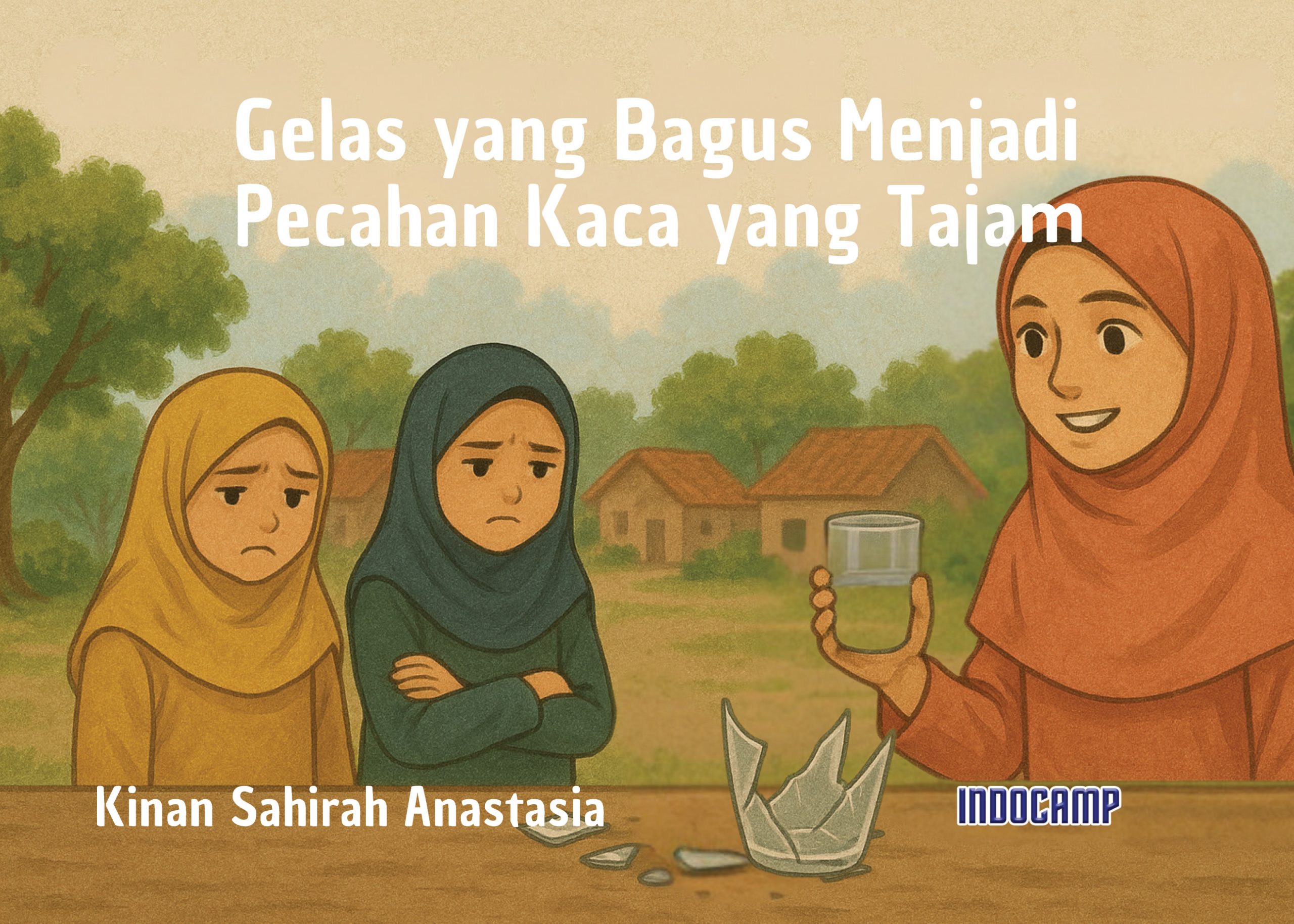 “Gelas yang Bagus Menjadi Pecahan Kaca yang Tajam” menceritakan persahabatan Kania yang selalu main bersama-sama temannya di kampung. Namun, segalanya berubah ketika ada warga baru yang bernama Femi, teman-temannya di kampung bertemu teman baru dan mulai melupakan Kania.